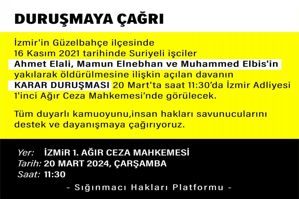 İzmir’in Güzelbahçe ilçesinde 16 Kasım 2021 tarihinde Suriyeli işçiler Ahmet Elali, Mamun Elnebhan ve Muhammed Elbiş'in yakılarak öldürülmesine ilişkin açılan davanın karar duruşması 20 Mart’ta saat 11.30’da İzmir Adliyesi 1’inci Ağır Ceza Mahkemesi’nde görülecek.
